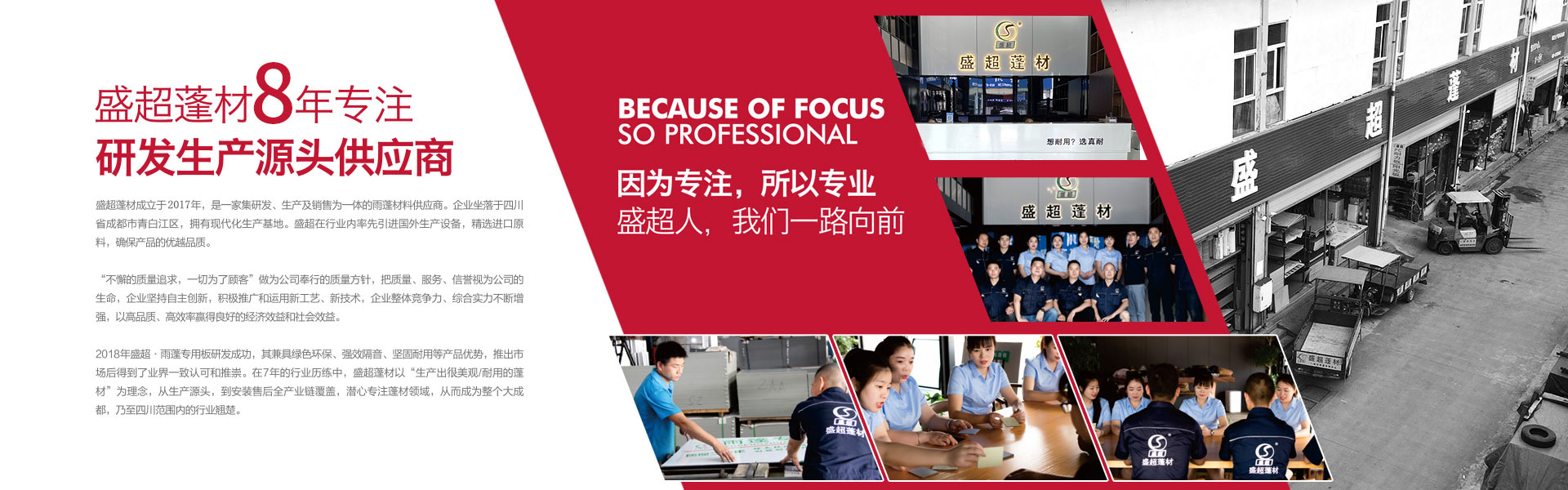 盛超蓬材是由四川超諾商貿有限公司創(chuàng)辦,是一家集研發(fā)、生產、銷售和服務于一體的專業(yè)雨蓬供應商。主要產品:實心耐力板,中空陽光板、多層板、蜂窩板、鋁瓦、消聲鋁瓦、不銹鋼消聲等材料的雨蓬產品。自主研發(fā)多款雨蓬,擁有自己的專利和檢測報告。其中明星產品新型組裝式雨蓬,擁有組裝簡便,美觀耐用、抗噪音,性價比高等優(yōu)勢,多項檢測指標領跑同行業(yè)。受到了市場和經銷商的高度認可。 公司自成立至今,從銷售到研發(fā)再到生產,已經過了3次跨越式的發(fā)展。2017年已成為四川雨蓬行業(yè)內庫房面積大,員工多的一家公司。產值每年以平均20%的速度快速增長。可以說客戶是我們的老師,和他們合作使我們得到很多的學習機會來提高自身的技術水平和管理水平,是我們生產和發(fā)展的動力。